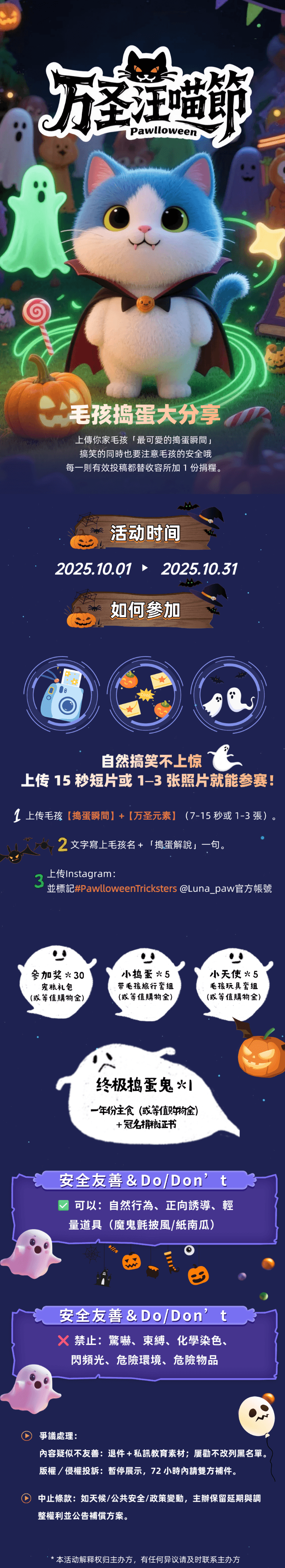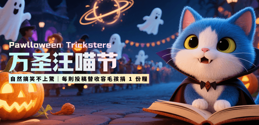 「Pawlloween 萬聖喵汪祭開跑!用最安全可愛的萬聖造型,拍 15 秒短片或 1–3 張照片,上傳打卡 #PawlloweenChallenge ,就有機會抱走寵糧大禮包,還能替收容毛孩加碼捐糧!」
